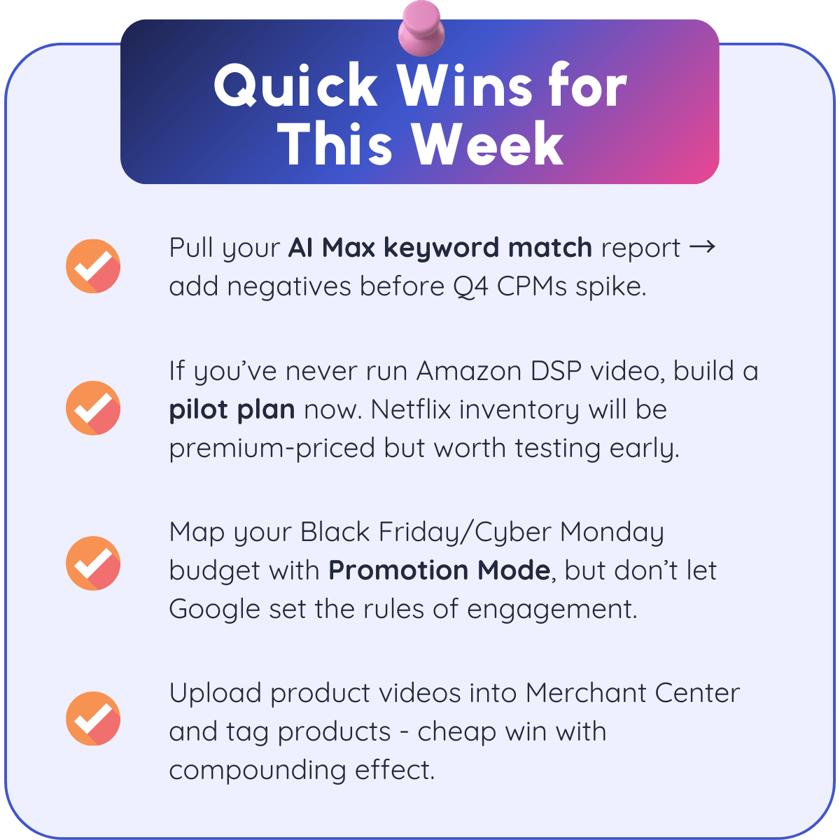 It’s easy to get lost in the flood of new features the platforms roll out, especially this time of year. The trick isn’t to try them all. It’s to focus on the two or three that actually move the needle on CAC, ROAS, or LTV for your business, and ignore the rest.